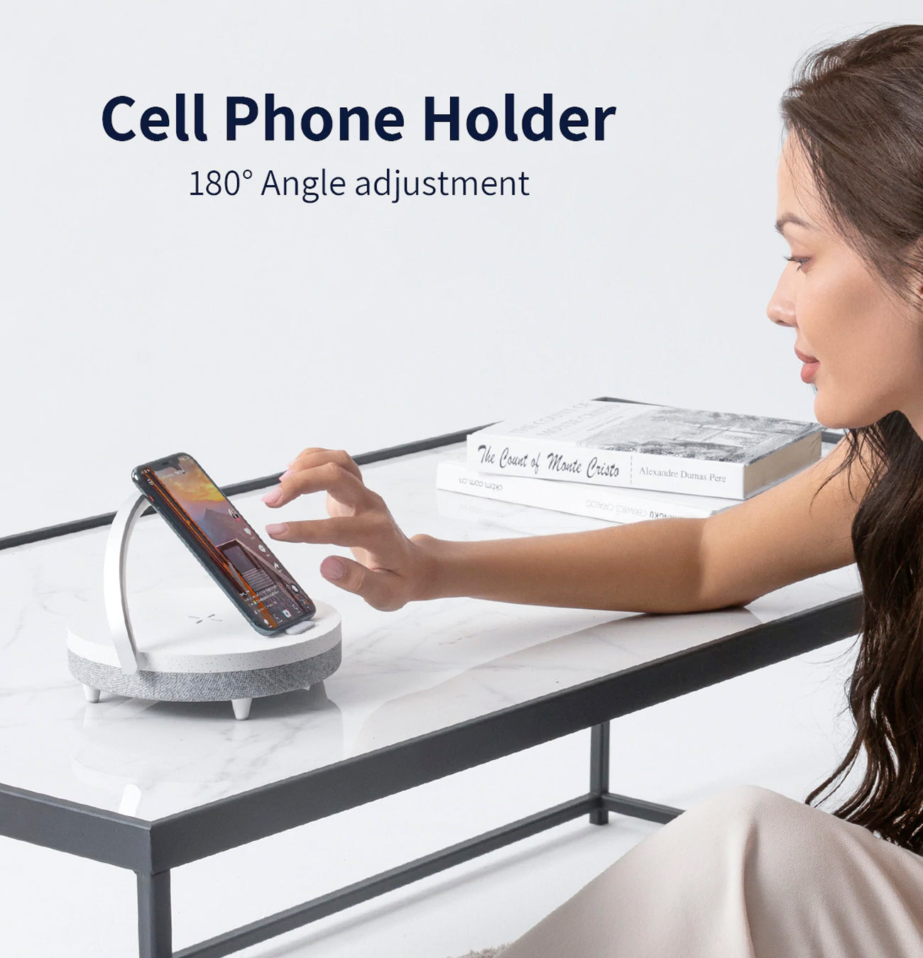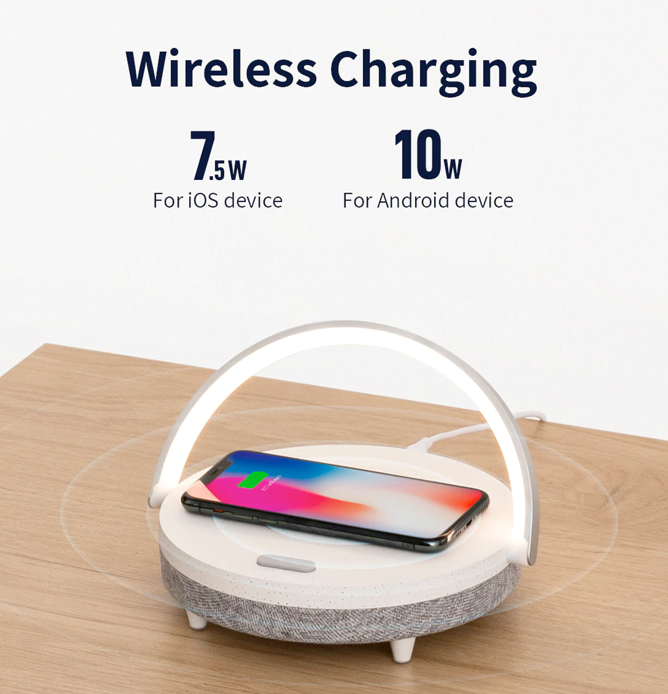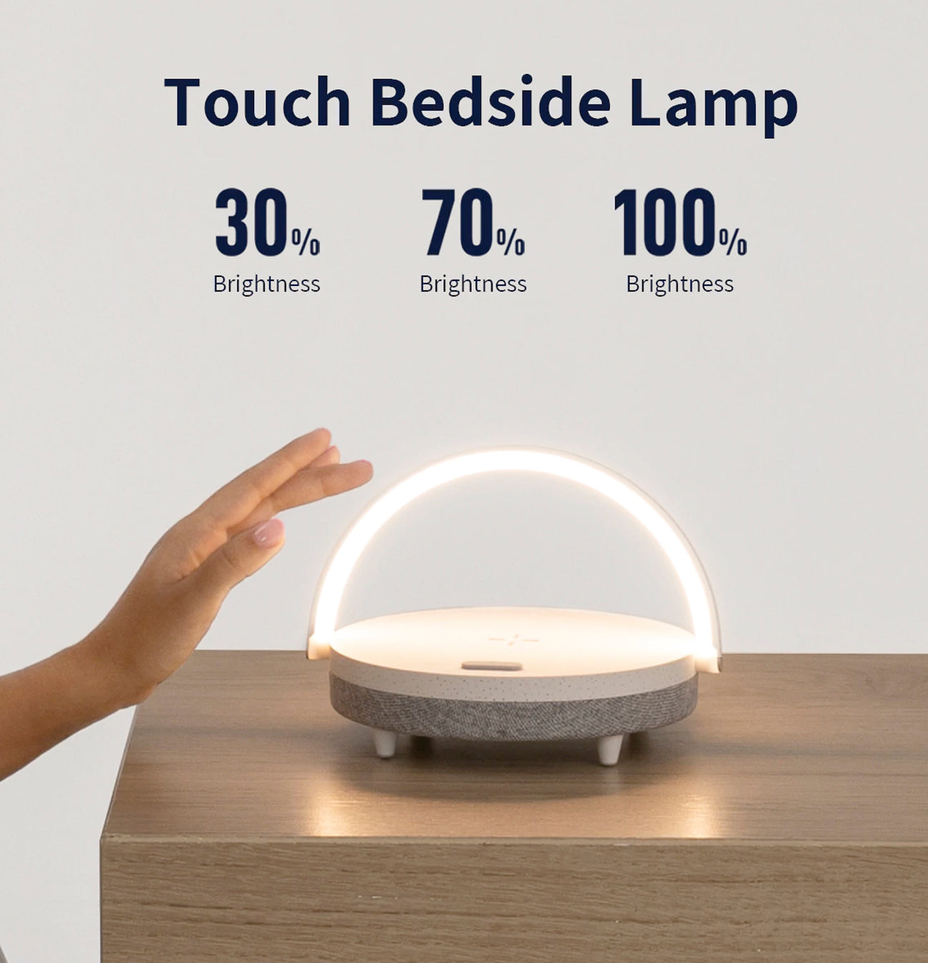 4-in-1 Bedside Lamp is a multi-purpose lamp for your relaxing and cozy lifestyle. It has brightness dimming, fast wireless phone charging, and Bluetooth speaker functions.